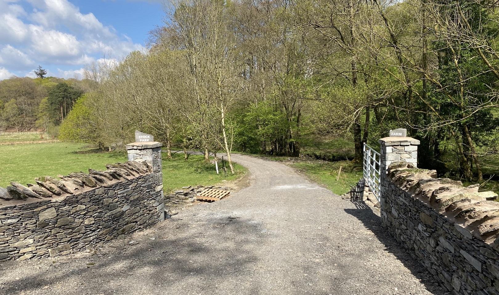 Then, about one hundred metres after the Stott Park Bobbin Mill, the entrance will appear on your right-hand side just before the road starts to via to the left. Our entrance has a metal gate that will be closed, the sign is Stock Park Farm. Please head down the track and over a stream, turning left where you will be greeted by Tom or Abi.